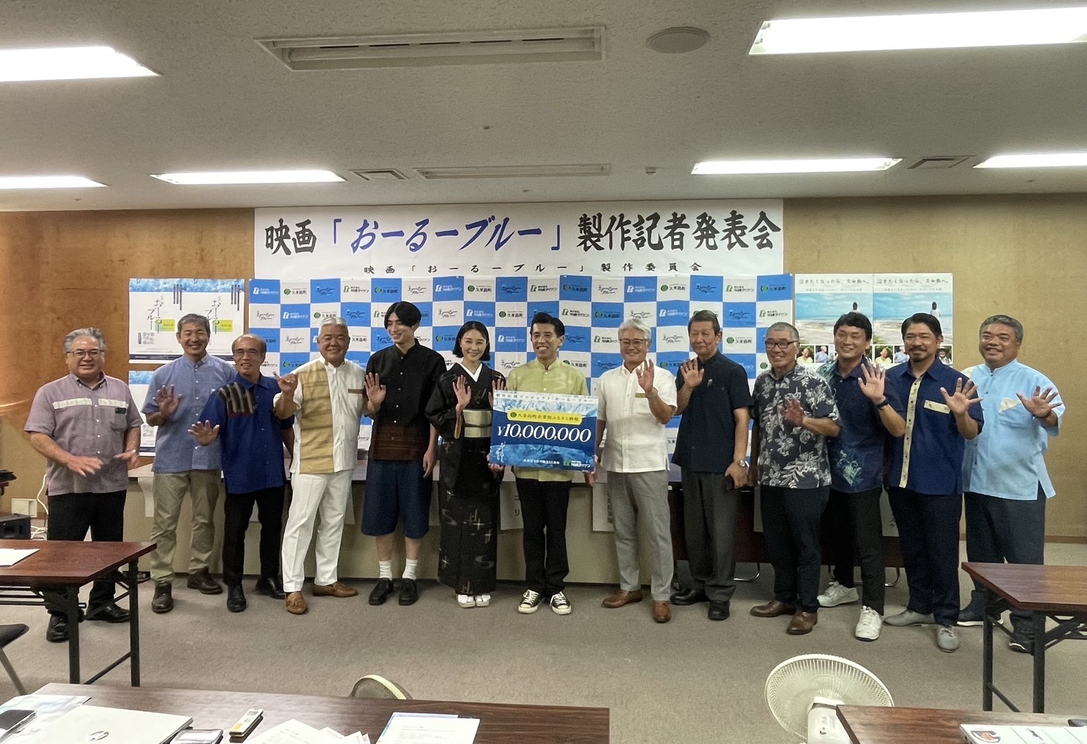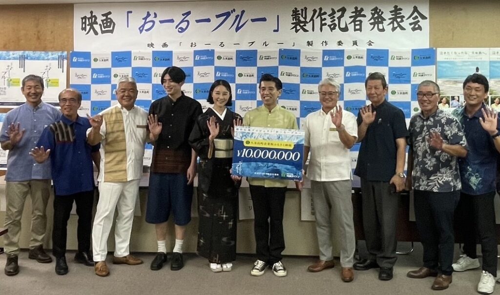 10月1日から久米島で撮影がスタートする映画「おーるーブルー」の製作発表会が9月9日(火)に沖縄県庁で行われ、これに併せて株式会社沖縄ダイケンから企業版ふるさと納税の贈呈式が行われました。